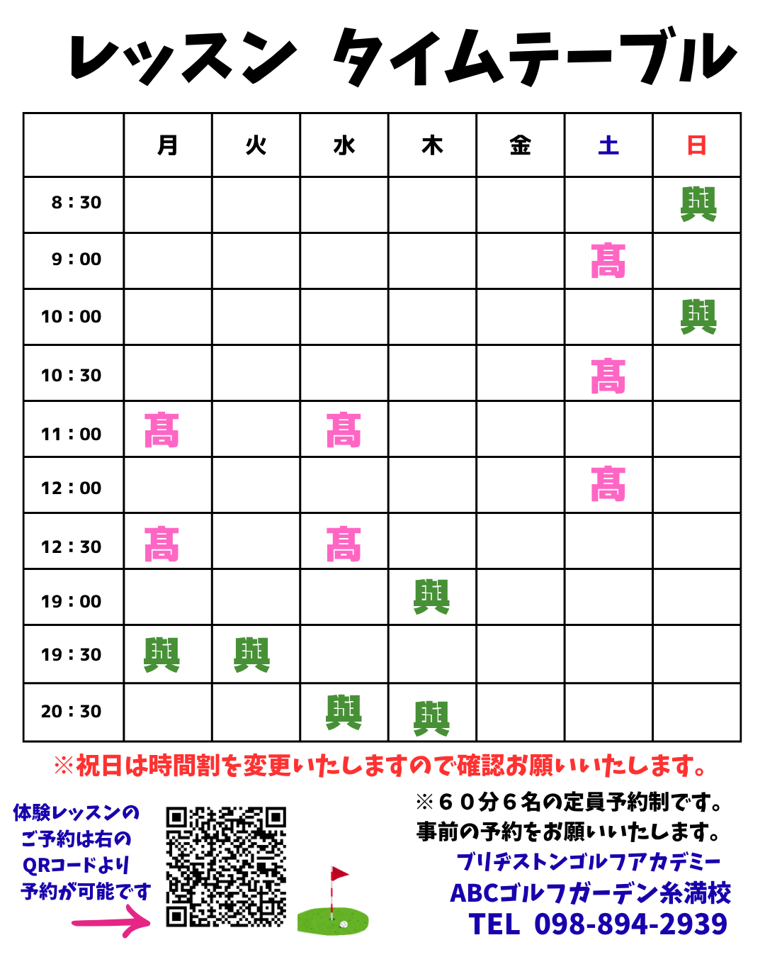 沖縄ブリヂストンゴルフアカデミー糸満校 レッスンスケジュール
