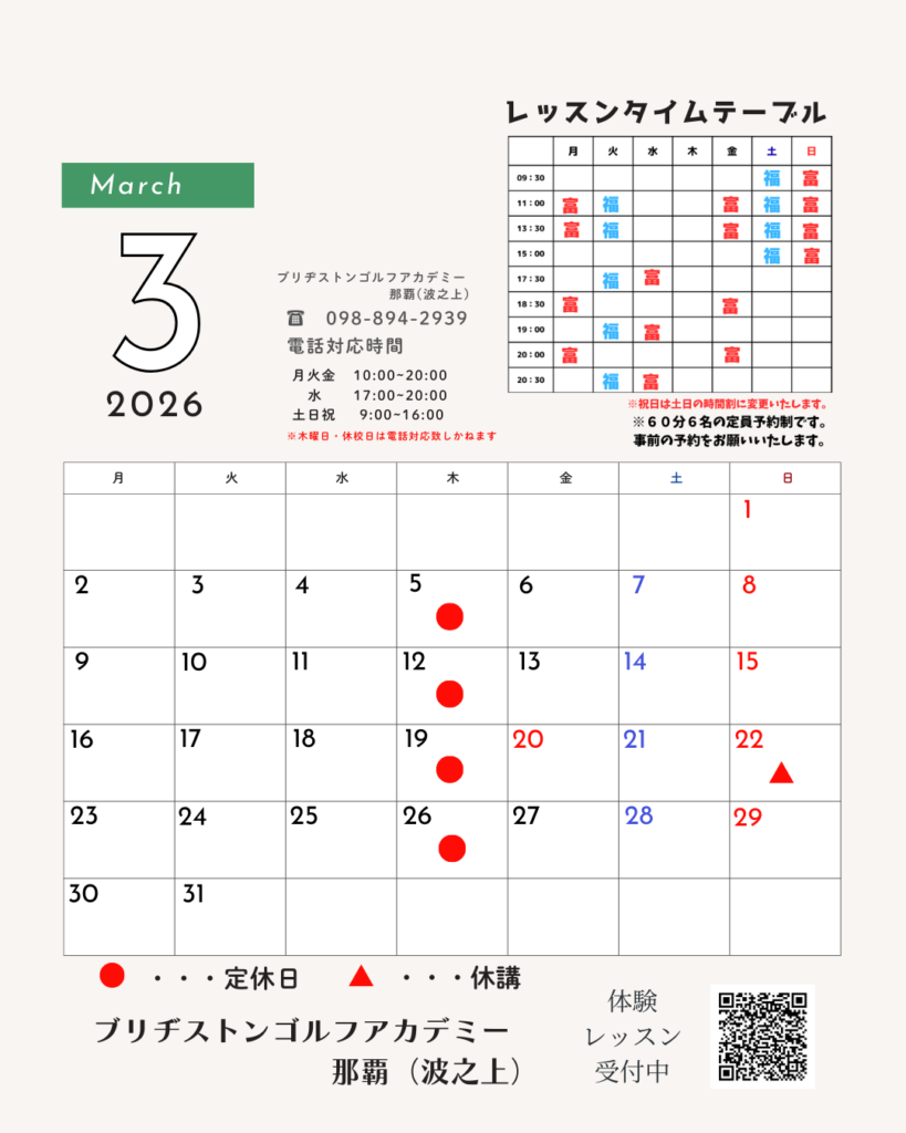 ★3月のキャンペーンのご案内です★ 今月の入会キャンペーンは入会時に22回券を購入するとレッスン3回券をプレゼントいたします! さらにインスタフォローされた方には登録料5,500円無料キャンペーンを行っているのでお得に入会してください! そして、スクール会員の方には目標達成応援キャンペーンを開催します。 今月最初のレッスンでインストラクターと一緒に目標を設定します。二か月間で達成できる目標を作りましょう♪ どんどん練習してレベルアップを目指しましょう♪ ~~~~~~ スクール生募集中 ~~~~~~ ブリヂストンゴルフアカデミー那覇 波之上では実際のレッスンを受けることができる体験レッスンを開催しております。ひとり一人に合わせたレッスンを行うのでレベル関係なく受講できます。ネットで簡単に予約可能です。初心者から上級者までお待ちしております。 体験レッスンの申し込みは↓から! https://backend.asg-school.com/trialregistrationstrict/5ad71e44cdc25a0f7a6f0d8c/lessons?p=65c652ad72225b850c3b02df ★インスタ始めました★ Instagram https://www.instagram.com/bsganaha2939/ ブリヂストンゴルフアカデミー那覇(波之上) ☎098-894-2939 記事のタイトルとURLをコピーする Post Share Hatena Pocket RSS feedly Pin it 期間限定!短期集中プラン 開催中!!! 前の記事 *★~ 試打会のご案内 ~★* 次の記事