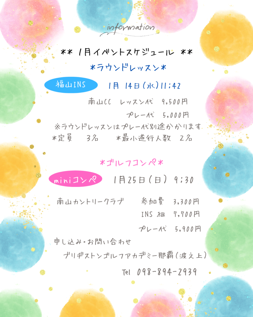 1月イベントのご案内です 12月も半ばになりました。 師走で忙しいと思いますが是非息抜きに練習に来てください!! 1月のコンペは南山カントリークラブで開催します! 2026年最初のコンペです❣ 楽しいコンペで良いスタートを切りましょう~❤ 皆様のご参加、是非!お待ちしております★ 年末年始のお休みは2025年12月28日(日)から2025年1月4日(日)となります。 ~~~~~~ スクール生募集中 ~~~~~~ ブリヂストンゴルフアカデミー那覇 波之上では実際のレッスンを受けることができる体験レッスンを開催しております。ひとり一人に合わせたレッスンを行うのでレベル関係なく受講できます。ネットで簡単に予約可能です。初心者から上級者までお待ちしております。 体験レッスンの申し込みは↓から! https://backend.asg-school.com/trialregistrationstrict/5ad71e44cdc25a0f7a6f0d8c/lessons?p=65c652ad72225b850c3b02df ★インスタ始めました★ Instagram https://www.instagram.com/bsganaha2939/ ブリヂストンゴルフアカデミー那覇(波之上) ☎098-894-2939 記事のタイトルとURLをコピーする Post Share Hatena Pocket RSS feedly Pin it 第2回 BSGAコンペ 参加ありがとうございました! 前の記事 年末年始の営業日のご案内 次の記事