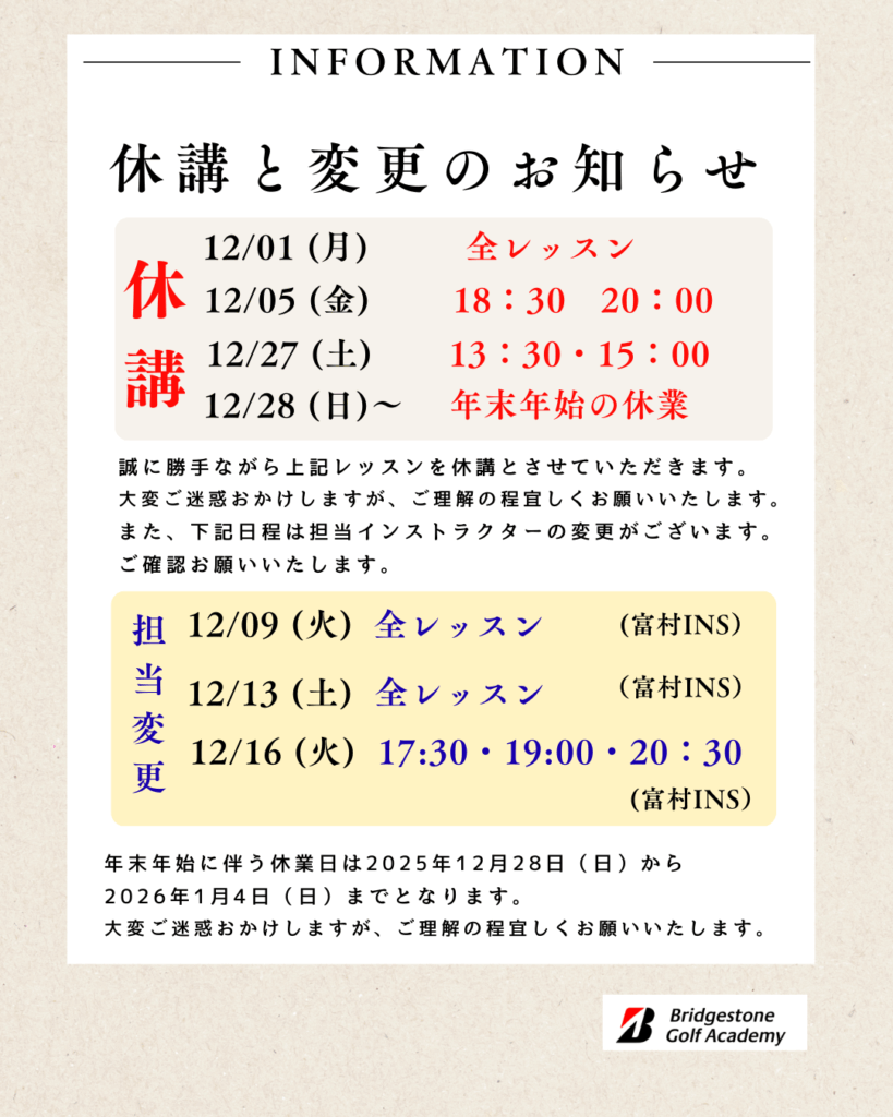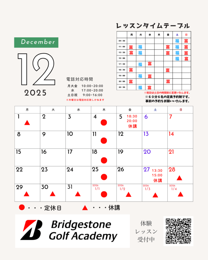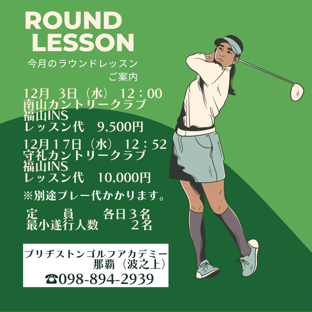 12月スケジュールです! 今月は忘年コンペと女子ゴルフコンペがあります★今年最後のラウンドは楽しく過ごせますように!! 年末年始のお休みは2025年12月28日(日)から2025年1月4日(日)となります。 ~~~~~~ スクール生募集中 ~~~~~~ ブリヂストンゴルフアカデミー那覇 波之上では実際のレッスンを受けることができる体験レッスンを開催しております。ひとり一人に合わせたレッスンを行うのでレベル関係なく受講できます。ネットで簡単に予約可能です。初心者から上級者までお待ちしております。 体験レッスンの申し込みは↓から! https://backend.asg-school.com/trialregistrationstrict/5ad71e44cdc25a0f7a6f0d8c/lessons?p=65c652ad72225b850c3b02df ★インスタ始めました★ Instagram https://www.instagram.com/bsganaha2939/ ブリヂストンゴルフアカデミー那覇(波之上) ☎098-894-2939 記事のタイトルとURLをコピーする Post Share Hatena Pocket RSS feedly Pin it アプローチレッスン会開催しました!3(完結編) 前の記事 第2回 BSGAコンペ 参加ありがとうございました! 次の記事