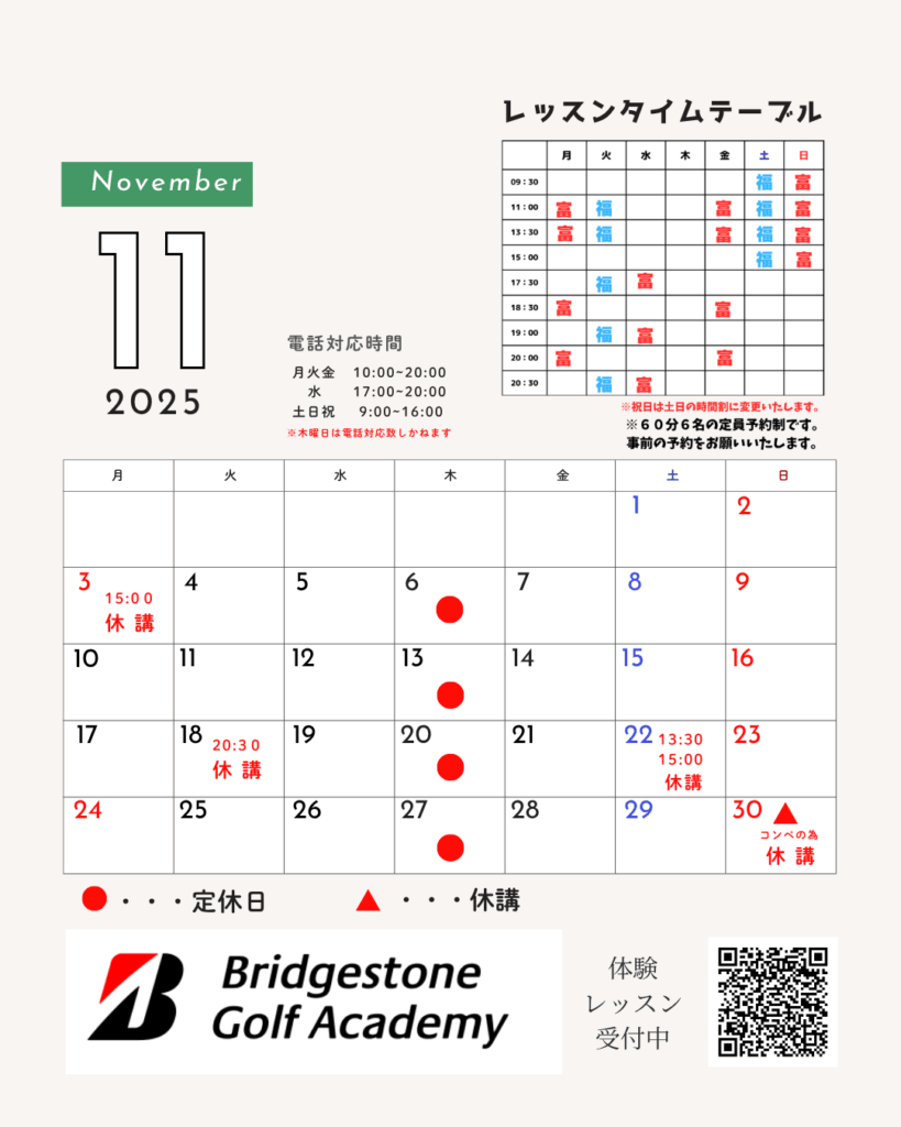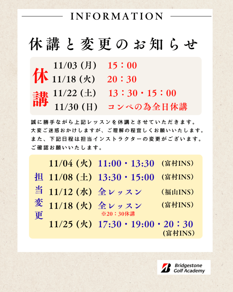 また、担当インストラクターの変更日程がありますので、ご確認お願いいたします。